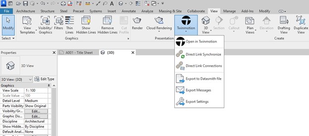 Videćete novu Twinmotion ikonicu na traci za navigaciju. Zadržite strelicu miša iznad nje i kliknite „Open in Twinmotion“. Ovo će pokrenuti Twinmotion za Revit i omogućiti vam da kreirate direktnu vezu između dve aplikacije tako da možete da izvezete svoj model sa samo nekoliko klikova. Takođe ćete imati mogućnost da otvorite i ažurirate postojeći projekat.