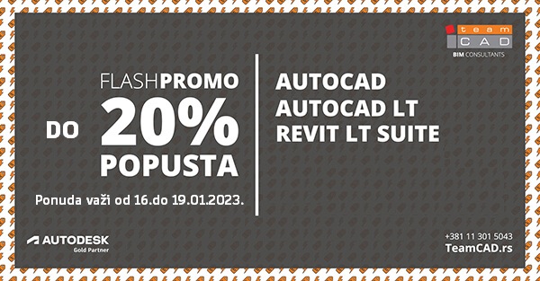 Od 16. do 19. januara 2023. godine traje Flash promocija u okviru koje možete ostvariti 20% popusta za jednogodišnji ili trogodišnji najam novih licenci sledećih Autodesk programa i kolekcija: