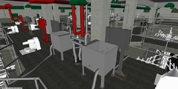 3D model prikazuje postavku opreme za bazene za flokulaciju, gde se dodaju koagulanti da bi se čestice i nečistoće zajedno povezale i lakše uklonile.