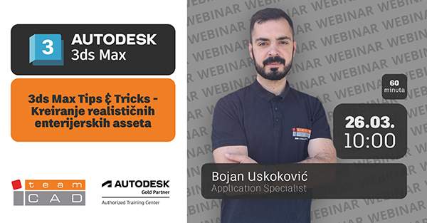 TeamCAD, ovlašćeni Autodesk trening centar, 26.3.2026. godine u 10h organizuje besplatan webinar „3ds Max Tips & Tricks: Kreiranje realističnih enterijerskih modela“.