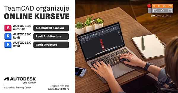 TeamCAD, kao autorizovani Autodesk trening centar (Autodesk Authorized Training Center), organizuje online kurseve za softvere: AutoCAD 2D, Revit Architecture i Revit Structure - osnovni nivo koji počinju 9.3. 2026. godine.